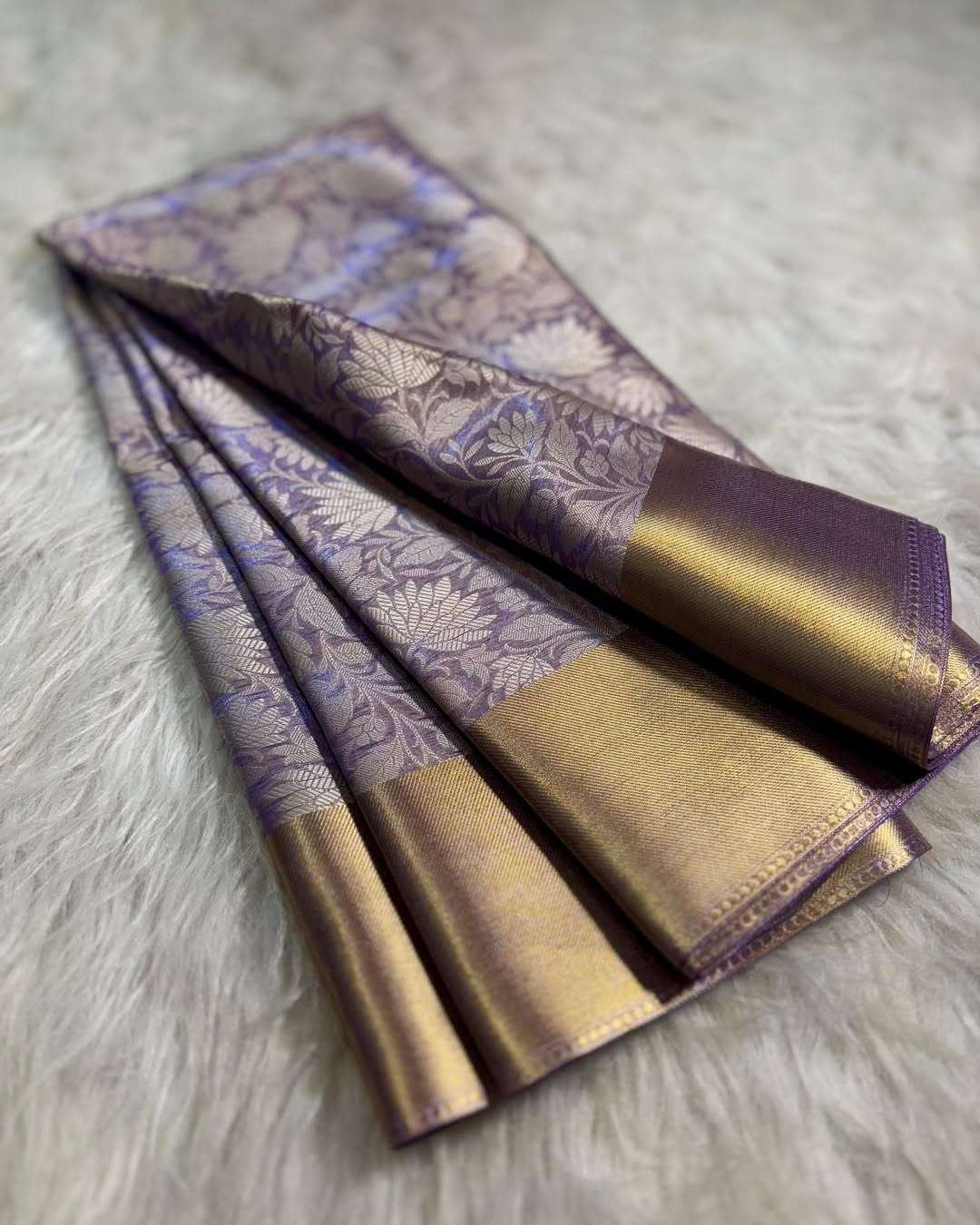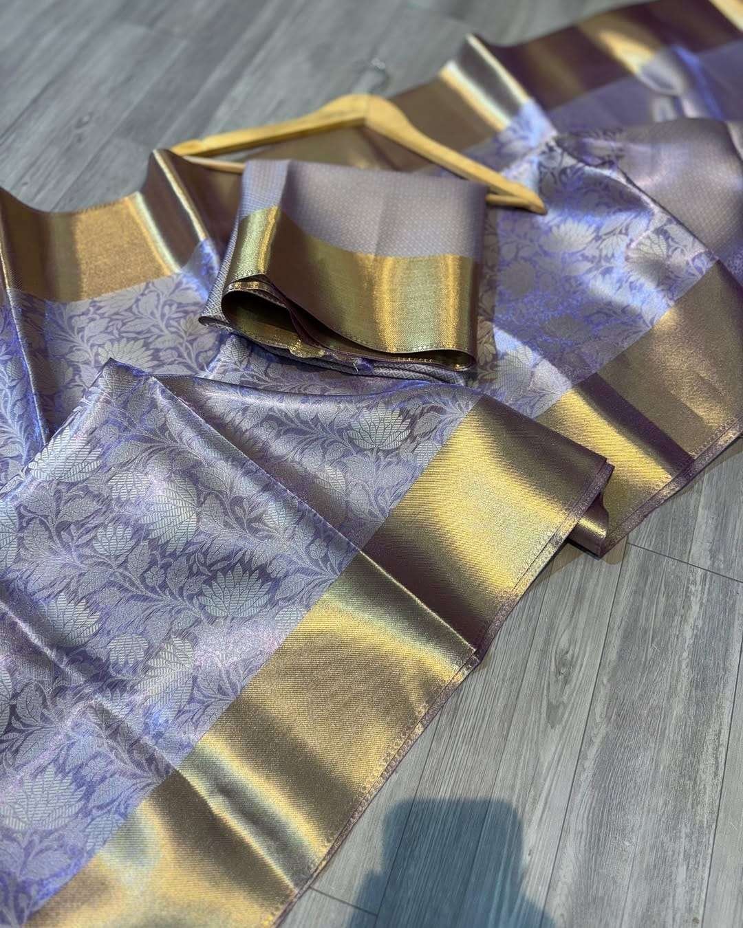 Luxurious Kanchipuram Tissue Saree in soft silk-metal blend featuring all-over jaal weave, fancy self-border, contrast zari pallu, and includes designer blouse piece. Lightweight and elegant for gifting and formal wear.